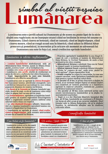 Având ca temă «Lumânarea – simbol al vieţii veşnice», materialul îşi propune să prezinte într-o formă accesibilă credincioşilor câteva informaţii despre mica noastră jertfă pe care o aducem înaintea lui Dumnezeu atunci când ne rugăm – lumânarea. Istoric, semnificaţii, îndemnul Sfinţilor părinţi dar şi alte aspecte privitoare la lumânare puteţi descoperi dacă parcurgeţi acest afiş catehetic.